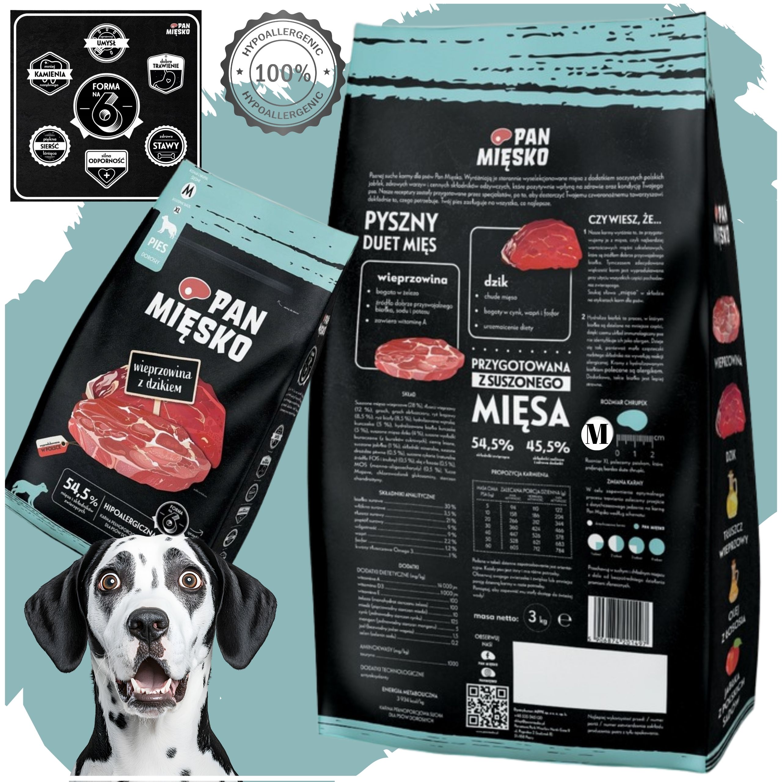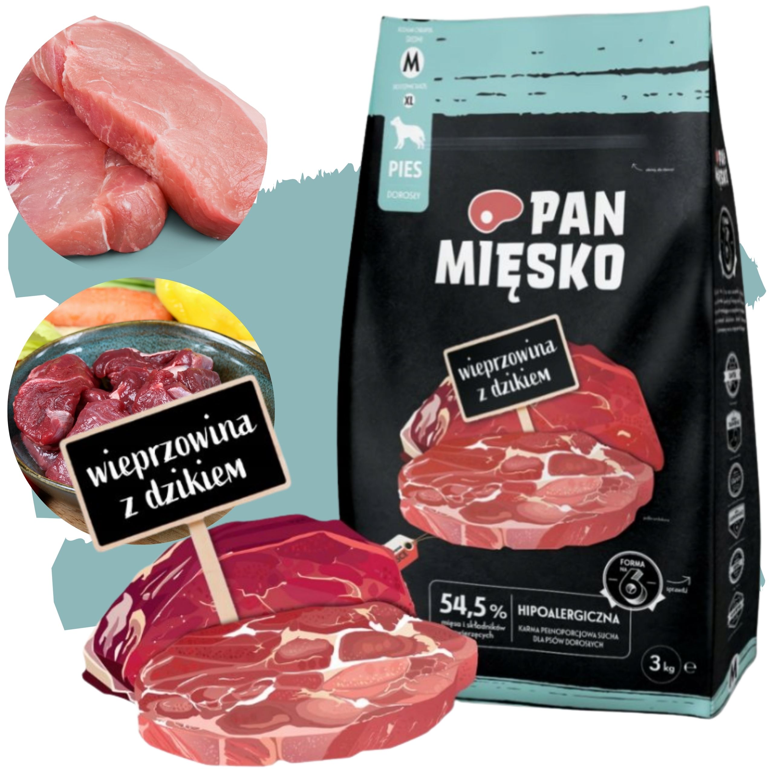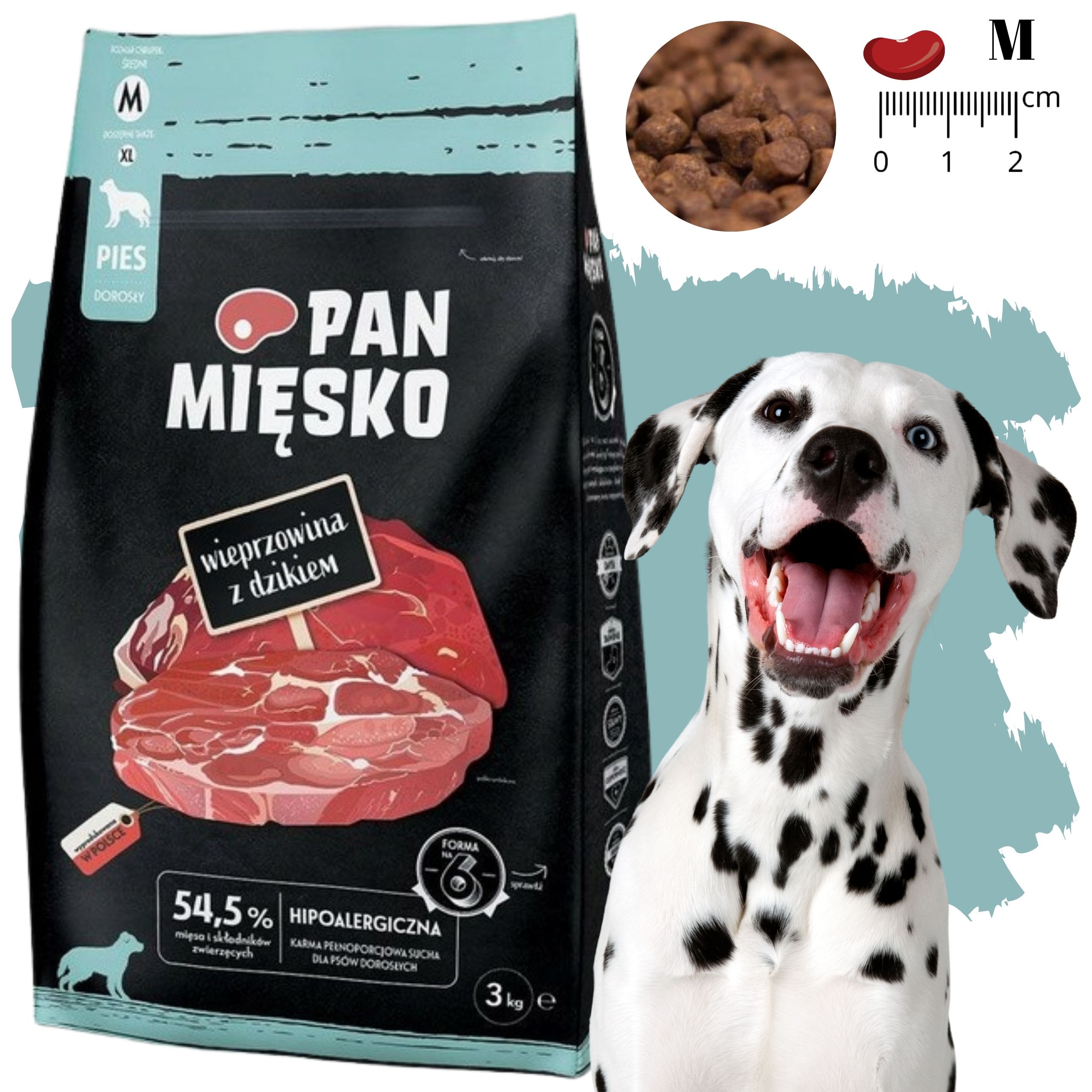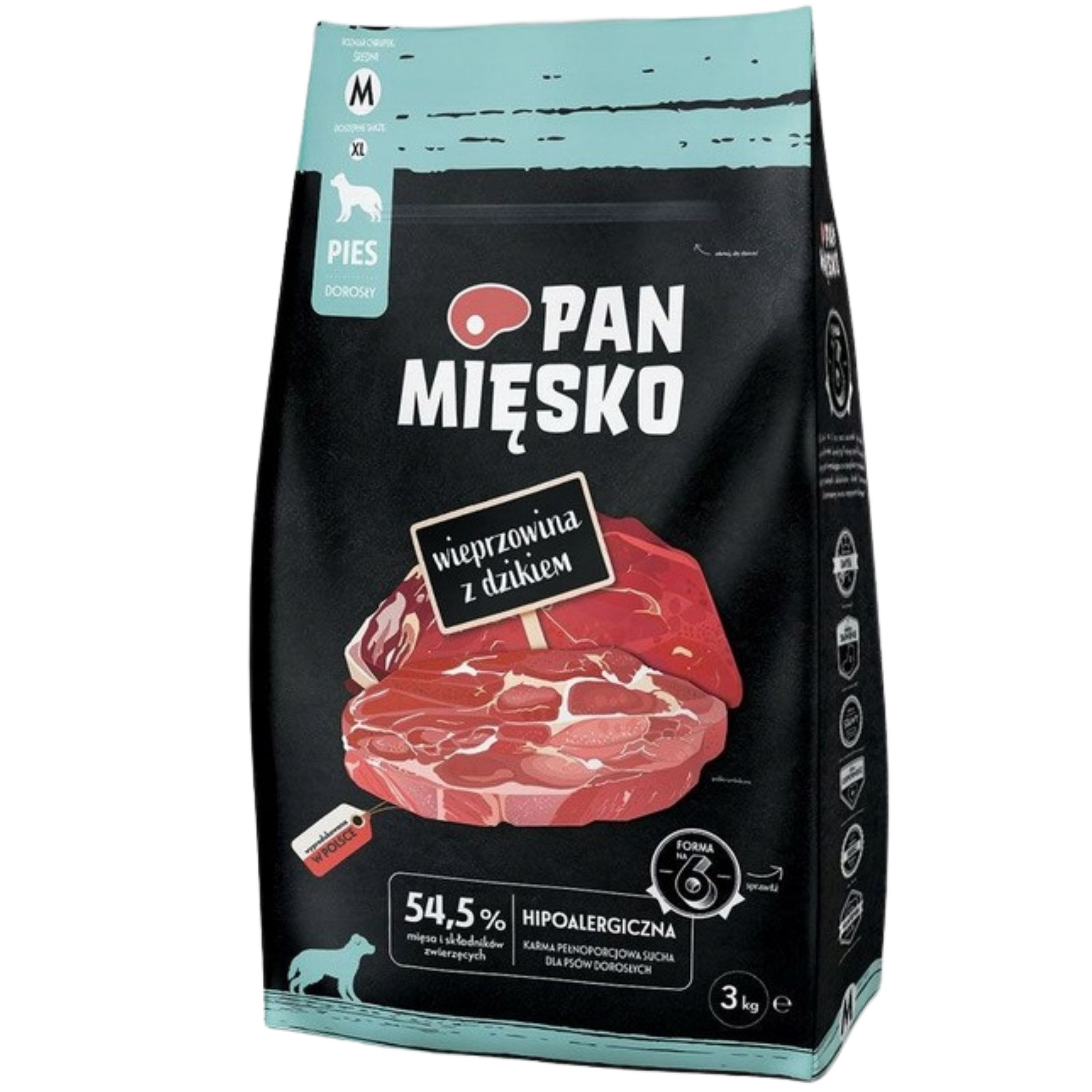 ❤️Pan Mięsko Wieprzowina z Dzikiem M 3kg to kompletna, hipoalergiczna sucha karma dla dorosłych psów ras średnich.