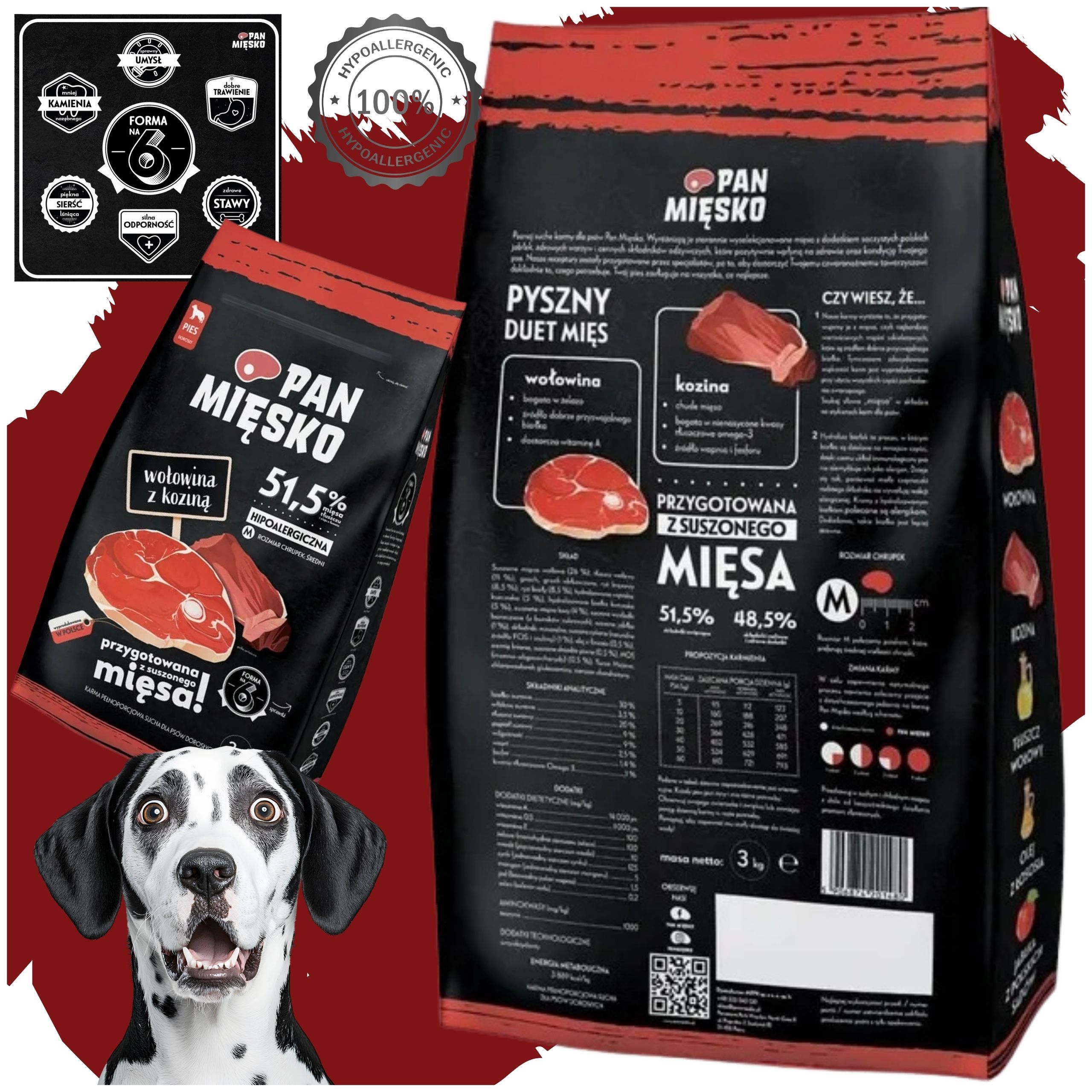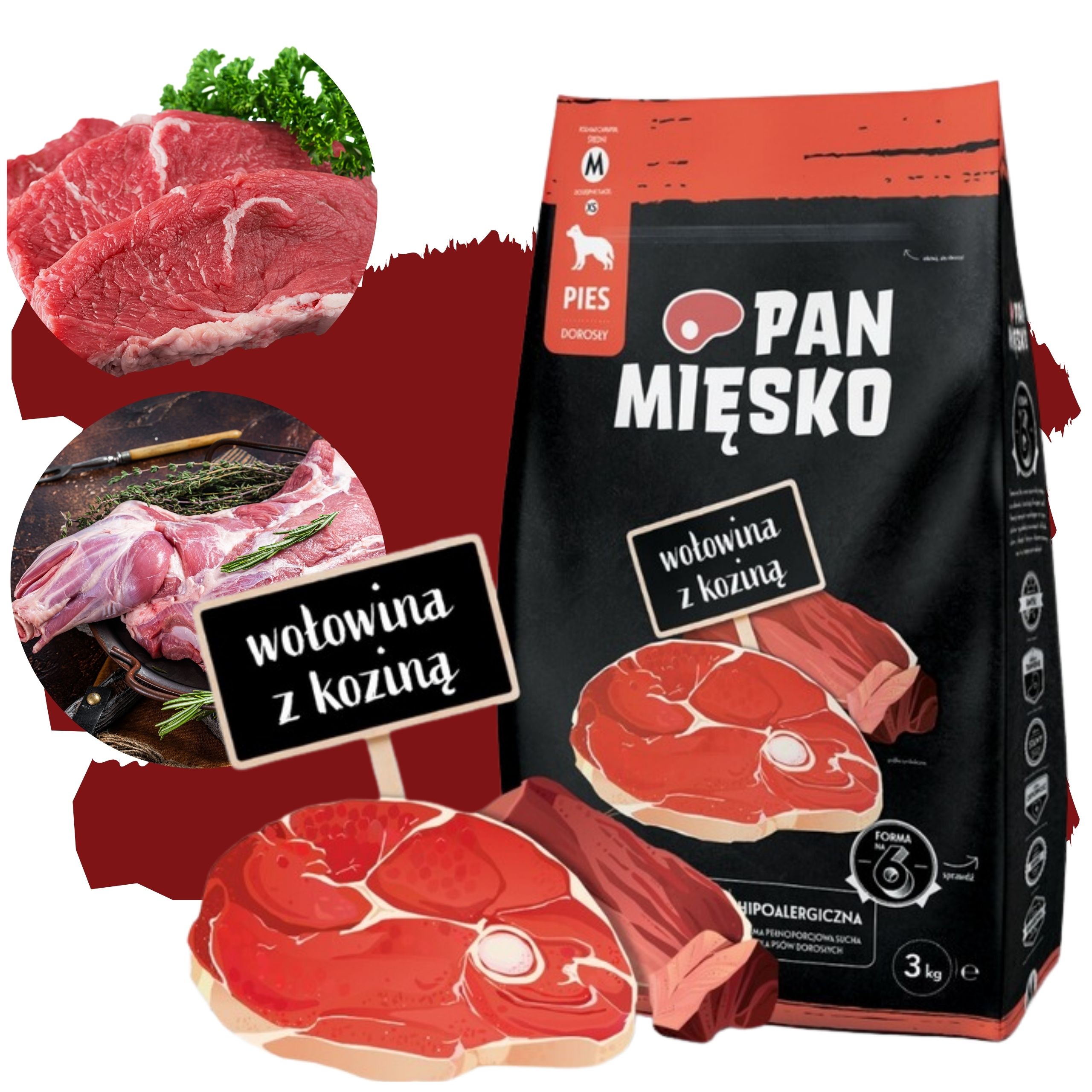 ❤️Pan Mięsko Wołowina z Koziną M 3kg to kompletna, hipoalergiczna sucha karma dla dorosłych psów ras średnich.